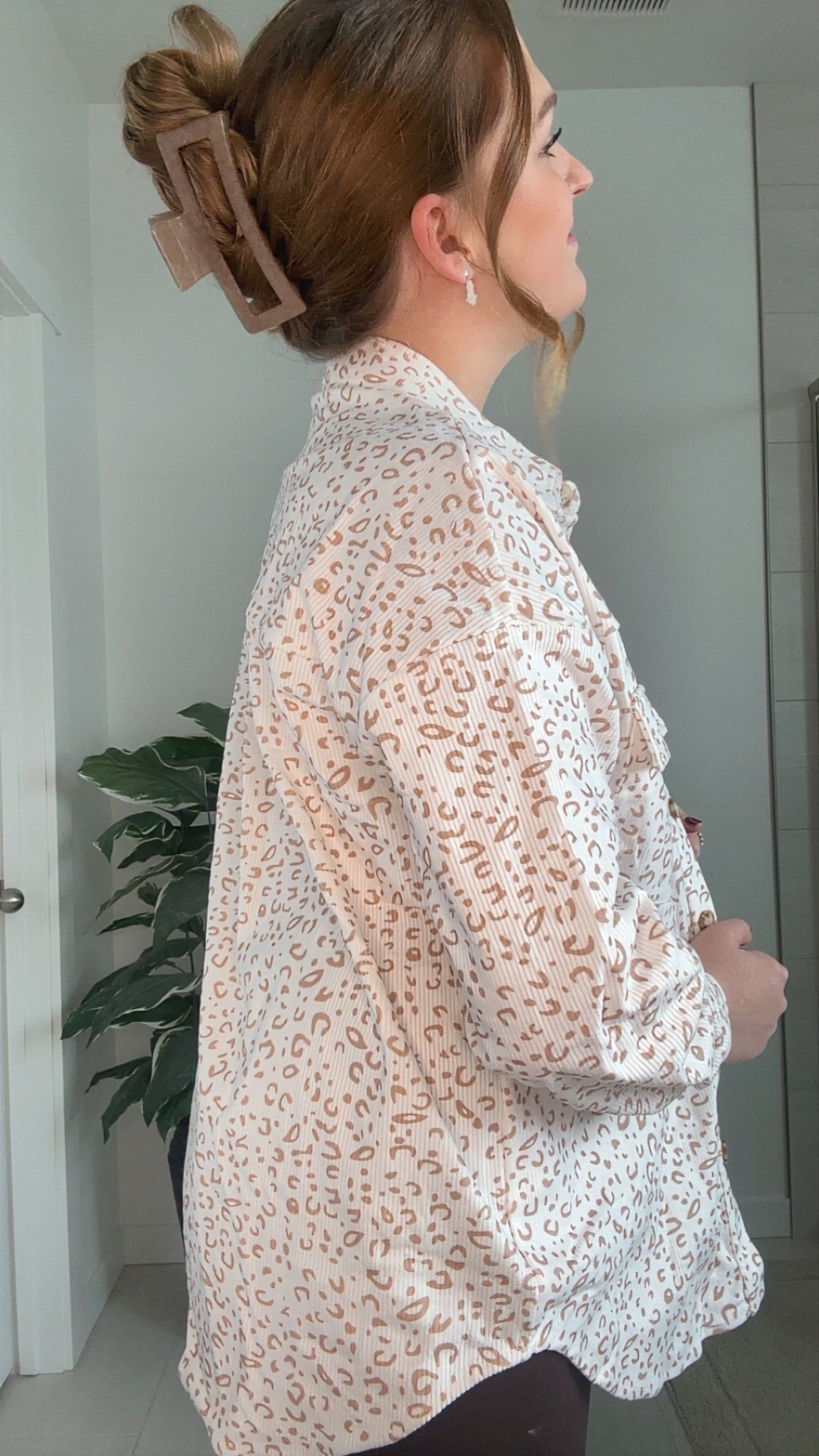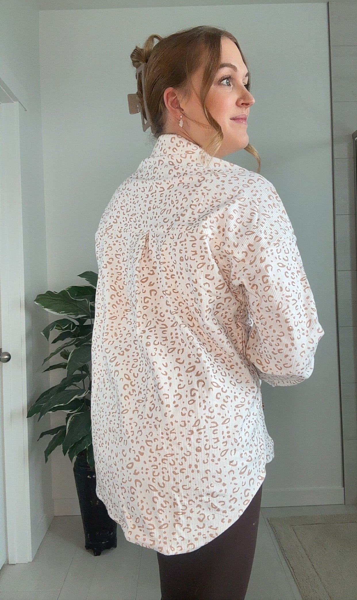 Soft, comfy, and effortlessly cute—this neutral leopard button-up is your new go-to. The super-soft fabric and relaxed fit make it perfect for layering, lounging, and everyday mom-life moments. Throw it over a tee or button it up for an instant, easy vibe.