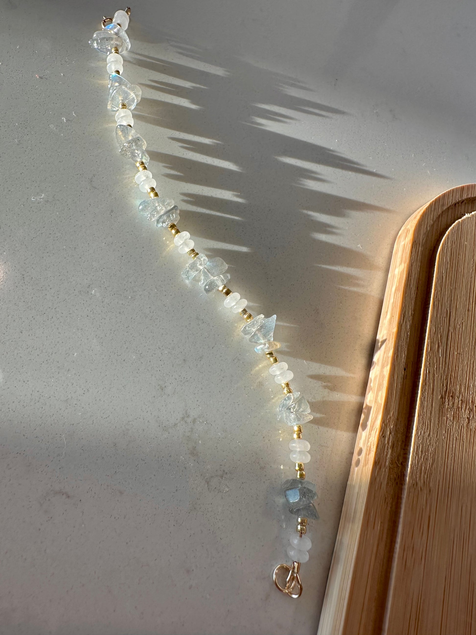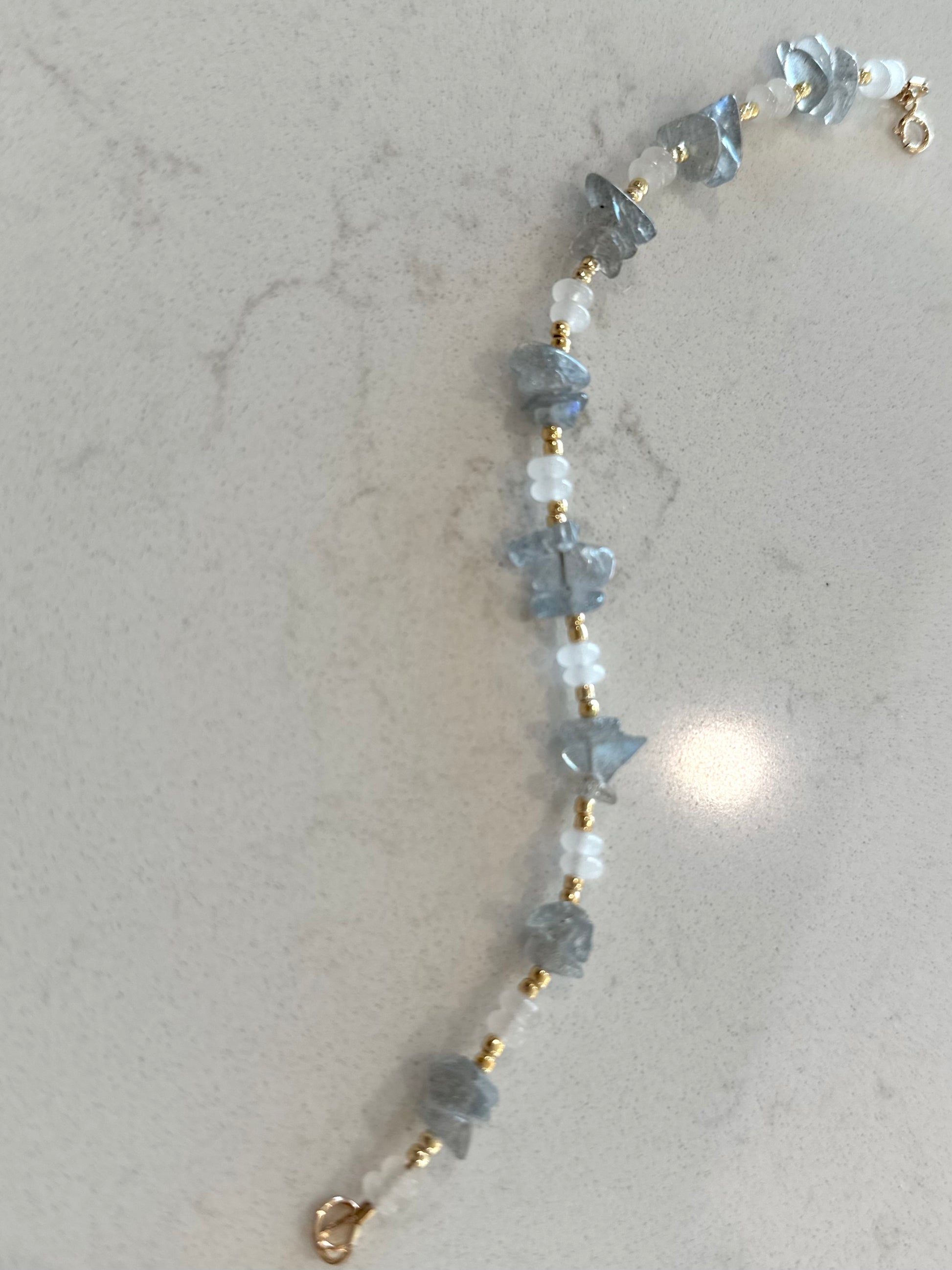 Meet your new go-to glow piece — this chic bracelet pairs dreamy labradorite chips with smooth white jade beads and golden accents for a look that’s both earthy and elegant. The labradorite catches the light with flashes of blue and gray magic, while white jade brings calm and balance.