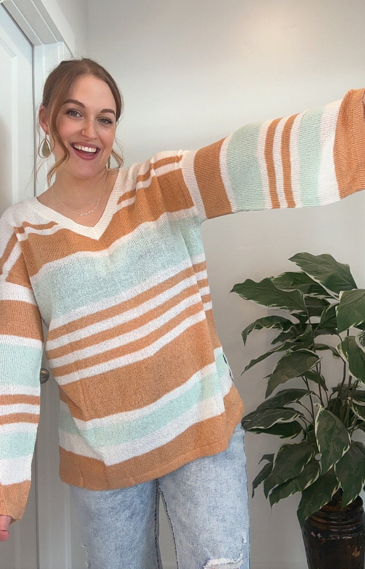This cozy knit features a dreamy mix of warm caramel, soft mint, and crisp white stripes that feel effortlessly cute without even trying. The relaxed fit, lightweight texture, and flattering V-neck make it the perfect throw-on for busy mornings, coffee runs, or those “I want to look put together but stay comfy” days.