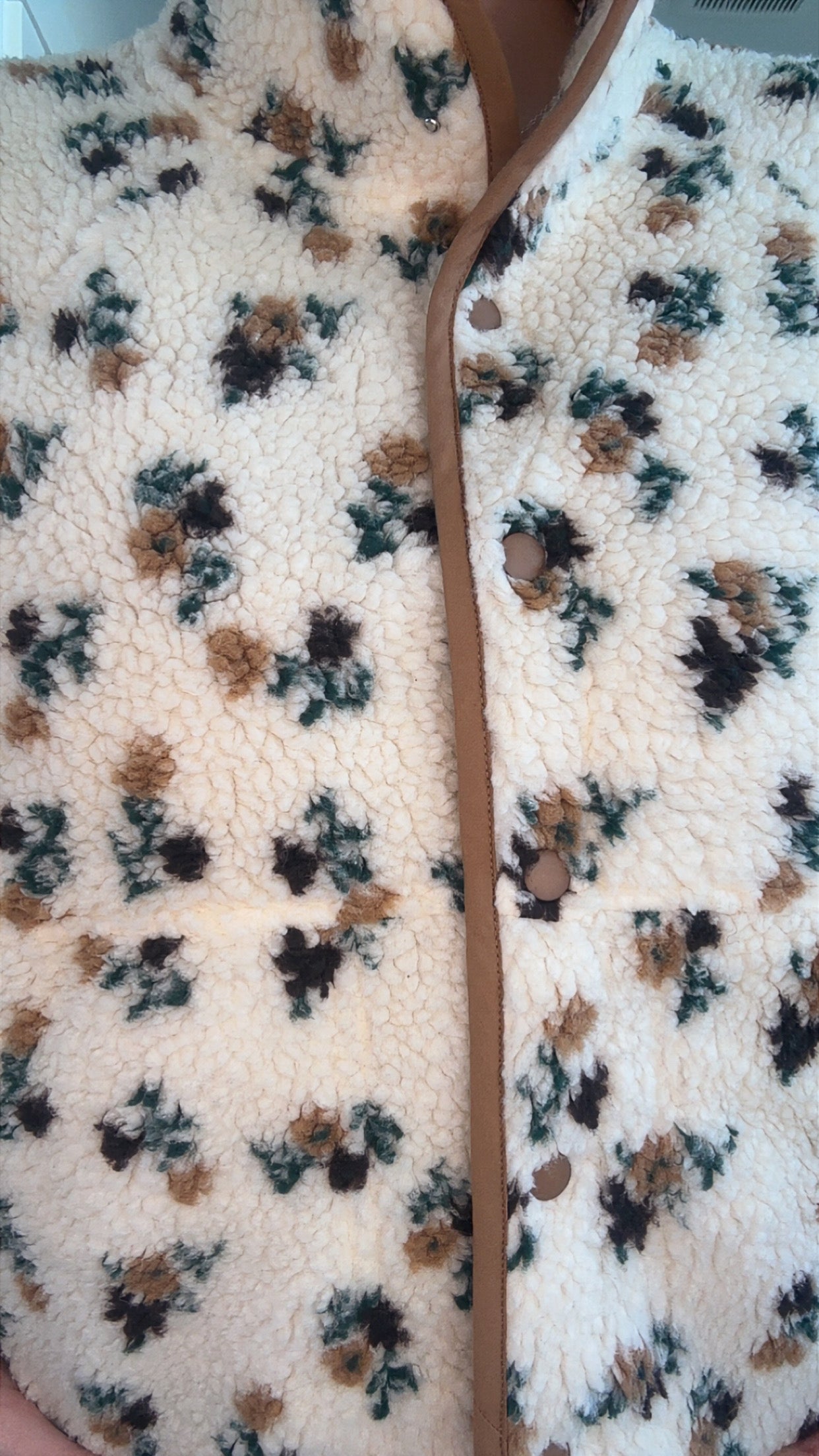 This floral fleece jacket is made from 100% polyester and feels like a warm hug you’ll never want to take off. The cream base with vintage-inspired blooms gives it that effortlessly cute, throw-on-and-go vibe. Finished with contrast trim and snap buttons for a touch of modern charm.