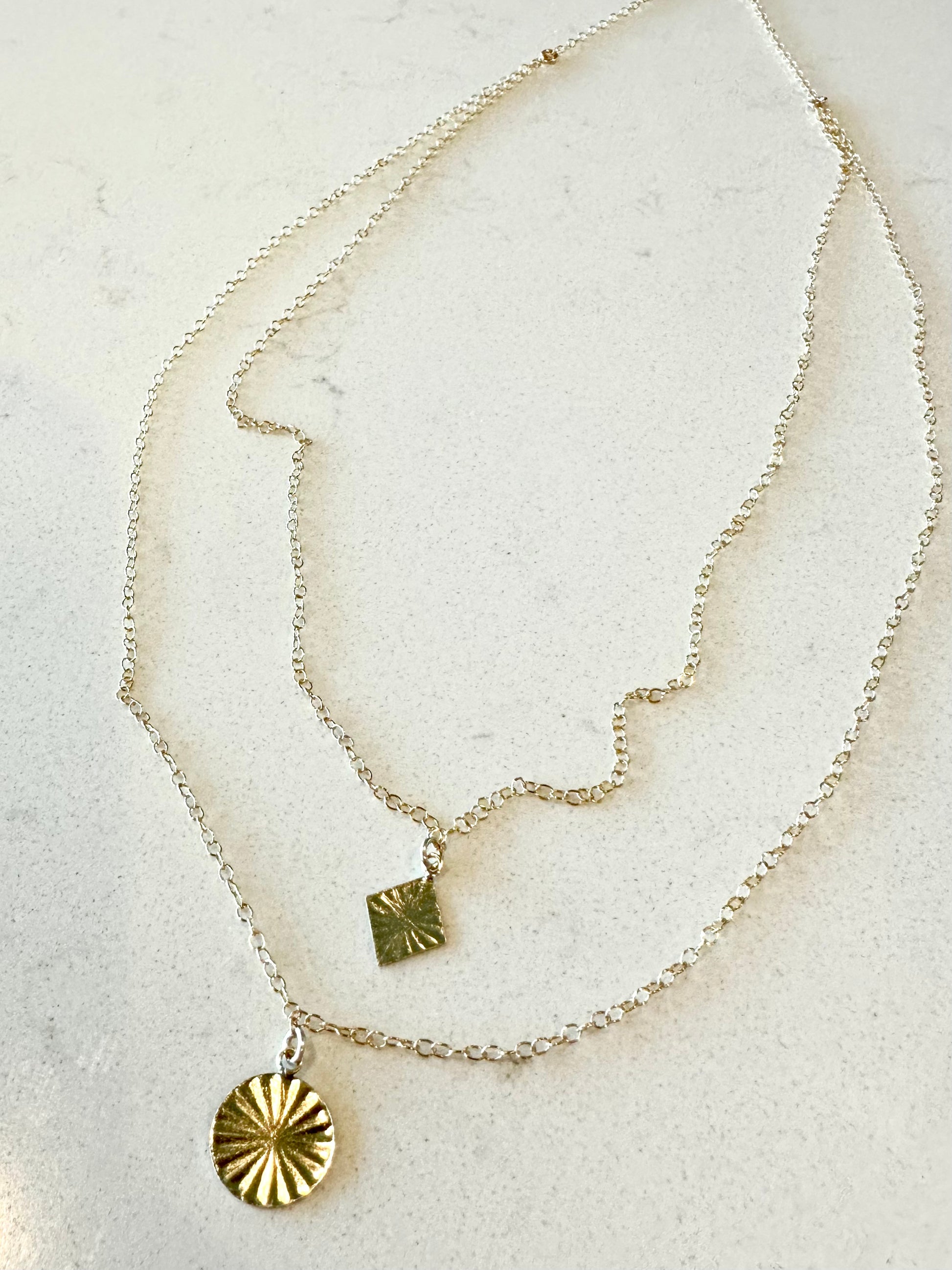 Meet your new everyday favorite — brings effortless shine with its double-layer design and sunburst-inspired charms. The mix of a small diamond-shaped pendant and a bold circular medallion adds just the right amount of glow and dimension. Chic, minimal, and perfectly stackable, it’s that “goes-with-everything” piece.